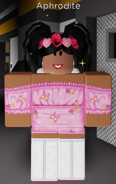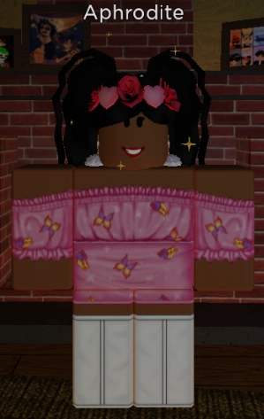 Aphrodite wears a pink off-the-shoulder crop-top shirt with butterfly prints, a pink mini-skirt, white earrings, a crown made of roses and hearts, and sparkles floating around her. She also wears thigh-high-heeled boots. She has her long curly black hair in two high ponytails. She has a warm russet-toned complexion and a "Miss Scarlet" face.