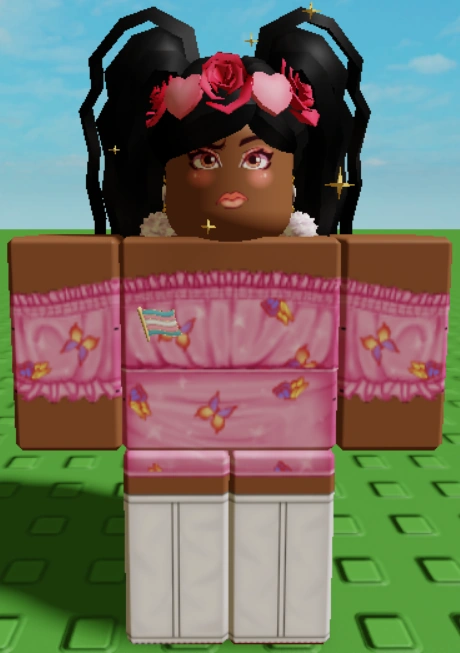 In her original appearance, she wore a transgender flag pin, her foundation matched her skin-tone, and Roblox artist Mugalo "Concerned Peachy" decal as a face.
