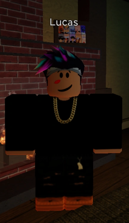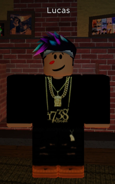 Lucas wears a black sweatshirt and a golden chain link necklace. He also wears black ripped pants with a yellow tag hanging onto a chain out of his right pocket, and light fudge-colored Ugg's shoes. He has spiked black hair with a widow's peak that contains magenta and cyan highlights and a white Disney Infinity baseball cap. He has a warm honey-nougat complexion and the "Grandma's Lipstick" face.