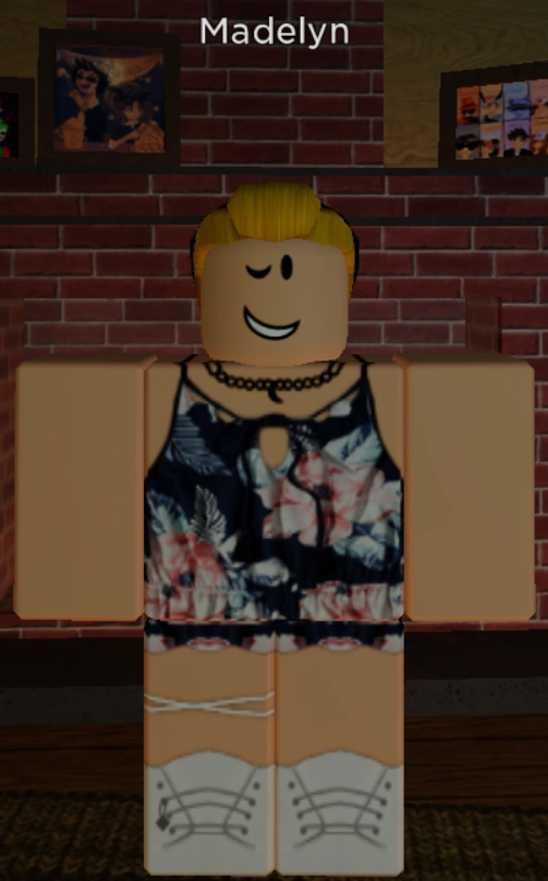 Madelyn wears a navy blue romper with floral prints and a black choker containing a crescent moon pendant. She also wears white sneakers and two thin white thigh accessories. She has her blonde hair tied into a bun. She has a sickly pale ivory complexion and the “Wink-Blink” face.