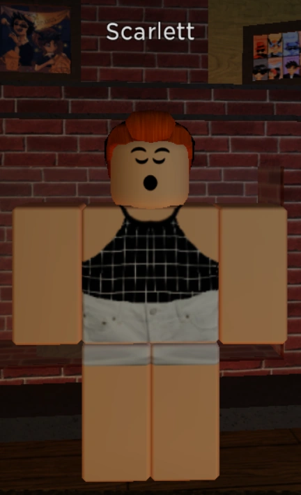 Scarlett wears a black halter top with white grid lines and white denim shorts. She has her ginger hair tied in a bun. She has a warm ivory complexion and the "Yawn" face.